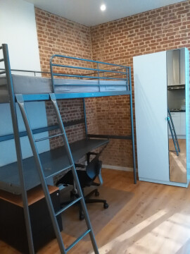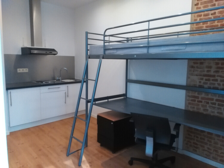De studio is bemeubeld met een hoogslaper met daaronder een bureau, bureaulade en kleerkast.