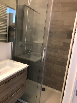 De badkamer is uitgerust met regendouche en hangtoilet en heeft ook een grote handdoekdroger.