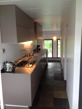Groot ingebouwde keuken met veel opbergruimte, werk-/ eethoek. Leefruimte aan de voorgevel met balkon over het park. Een dubbelbed op wielen schuift onder de verhoogde keuken en ontpopt zich als slaapruimte.
