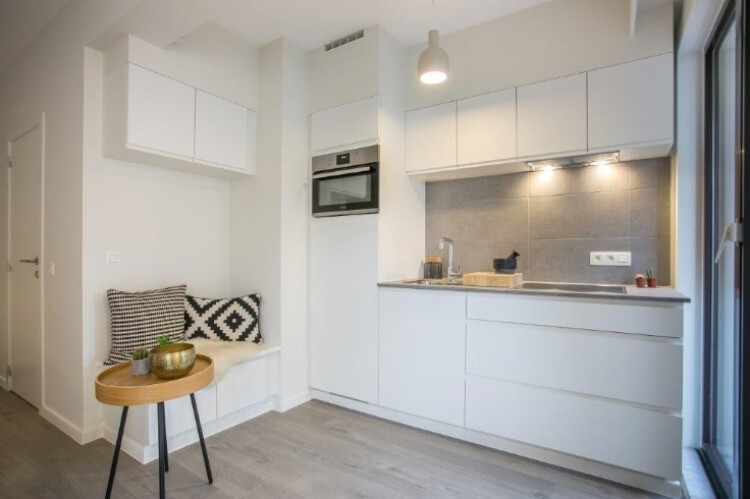 zithoek, is voorzien van een keramische kookplaat, oven en koelkast met vriesvak.