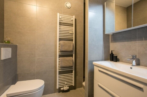 Een aparte modern badkamer met alle comfort: inloopdouche, wastafel, handdoekradiator en toilet. Bemeubeld: garderobe & bed met onderaan ladekasten.